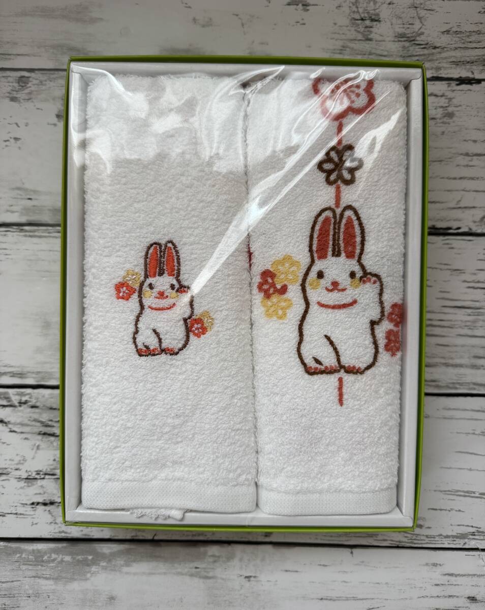 - 未使用★HOTMAN/ホットマン★うさぎ プリント 刺繍 フェイスタオル 2枚