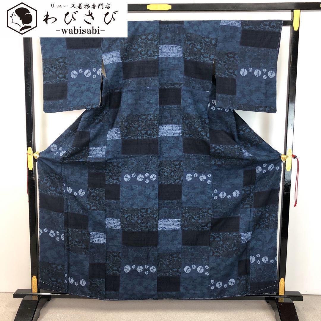 > 紬着物 絞り柄 型染 花柄模様 紺藍色 ますいわ屋 K-4537 着物 きもの kimono 和服 和装 中古 リサイクル着物 【送料無料】
