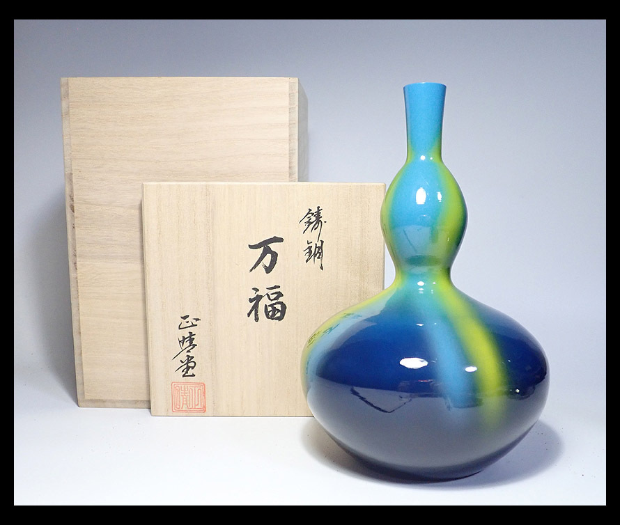 - 【海蛍】 高岡銅器 正晴造 鋳銅 瓢箪型 花瓶 「万福」 共箱付 高さ約20.5cm