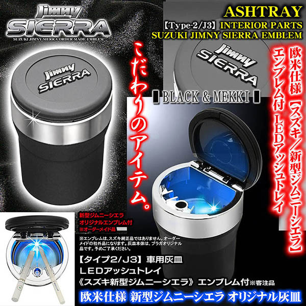- スズキ/新型ジムニーシエラ エンブレム付/車用灰皿/LEDアッシュトレイ/タイプ2・J3/欧米仕様/ブラック&メッキボディ/水洗いOK/ブラガ