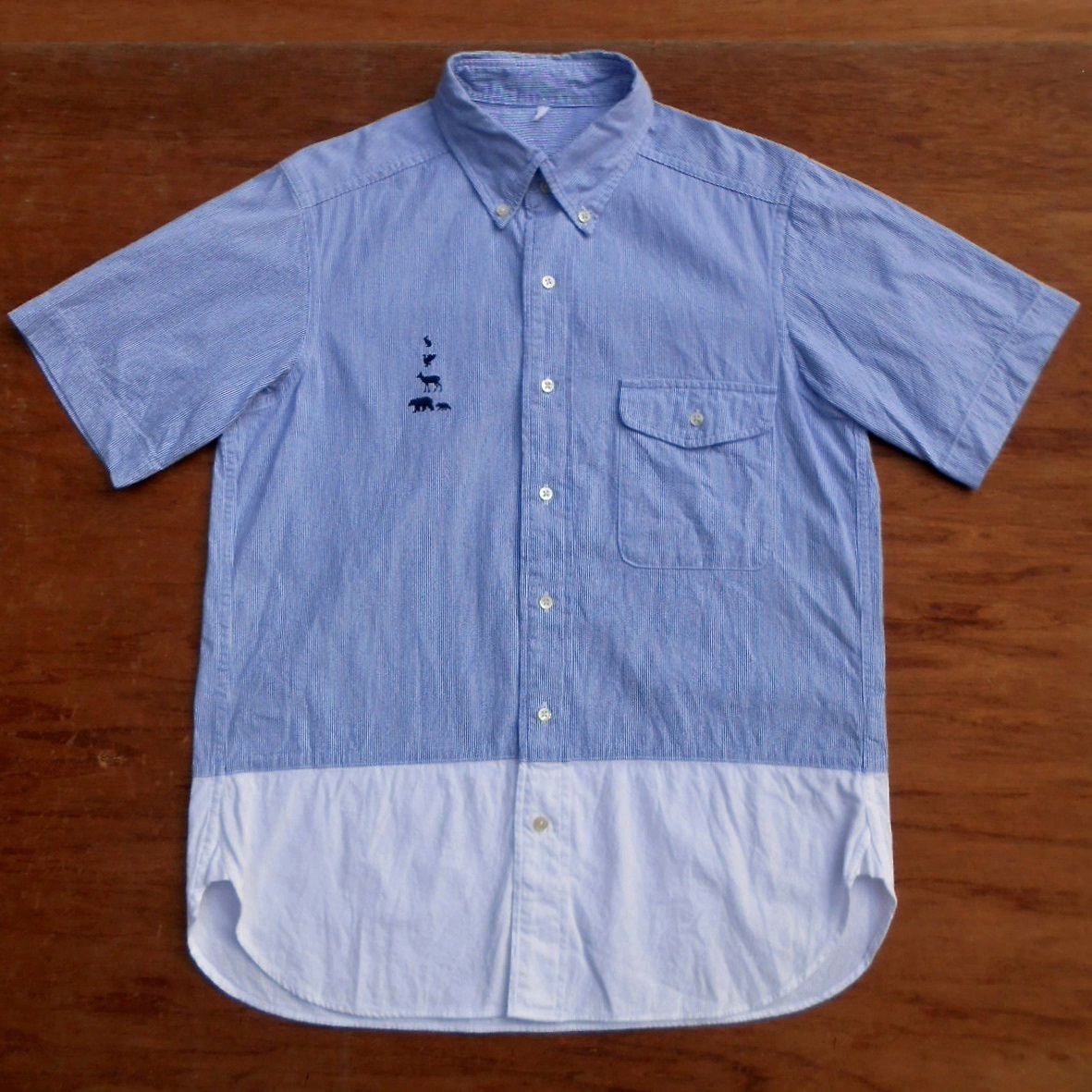 > 美品 Mountain Research マウンテンリサーチ WhiteTail B.D. S/S 半袖 シャツ 白x青 S 日本製 ストライプ織 切替 ブレーメン刺繍 MTR1213