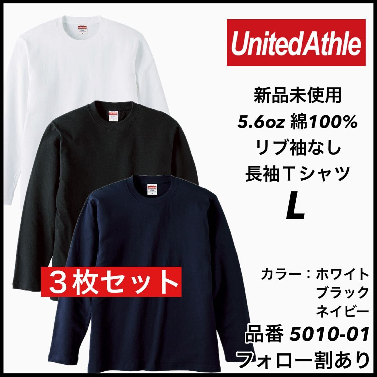 - 新品未使用 ユナイテッドアスレ United Athle 5.6oz 無地 袖リブなし 長袖Tシャツ ロンT 白黒ネイビー3枚セット Lサイズ ユニセックス