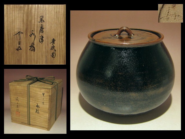- 溝手秀次 唐津黒天目釉水指★裏千家十五代鵬雲斎花押★o486