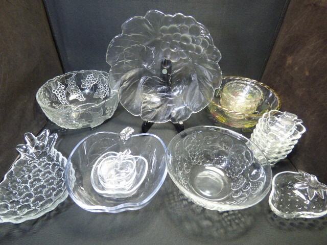 > ま418【19点セット】ガラス食器 ガラスの器 大皿 ボウル 盛鉢 小鉢 フルーツ柄 HOYA 盛皿 リンゴ ブドウ パイナップル さくらんぼ