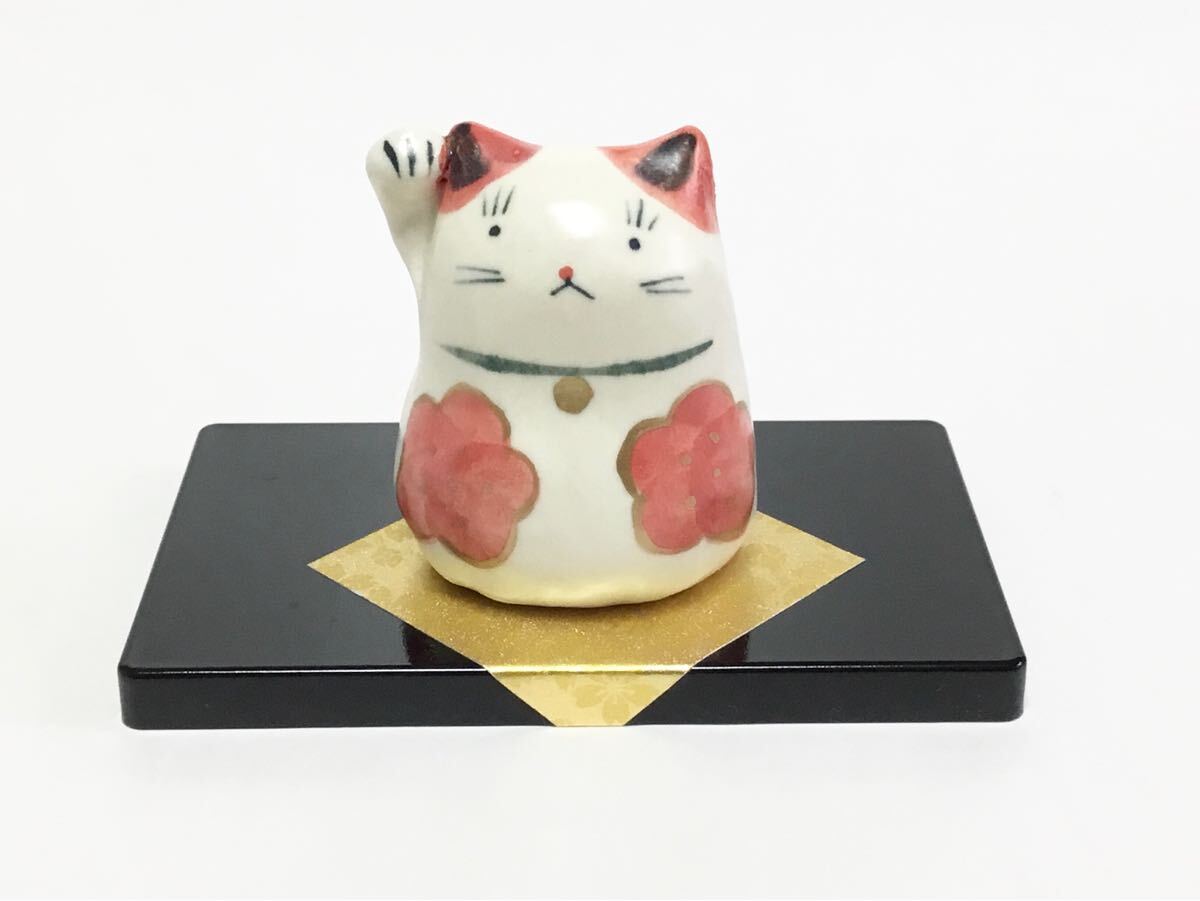 - 招き猫置物 手描き 招猫・赤花 瀬戸焼 新品