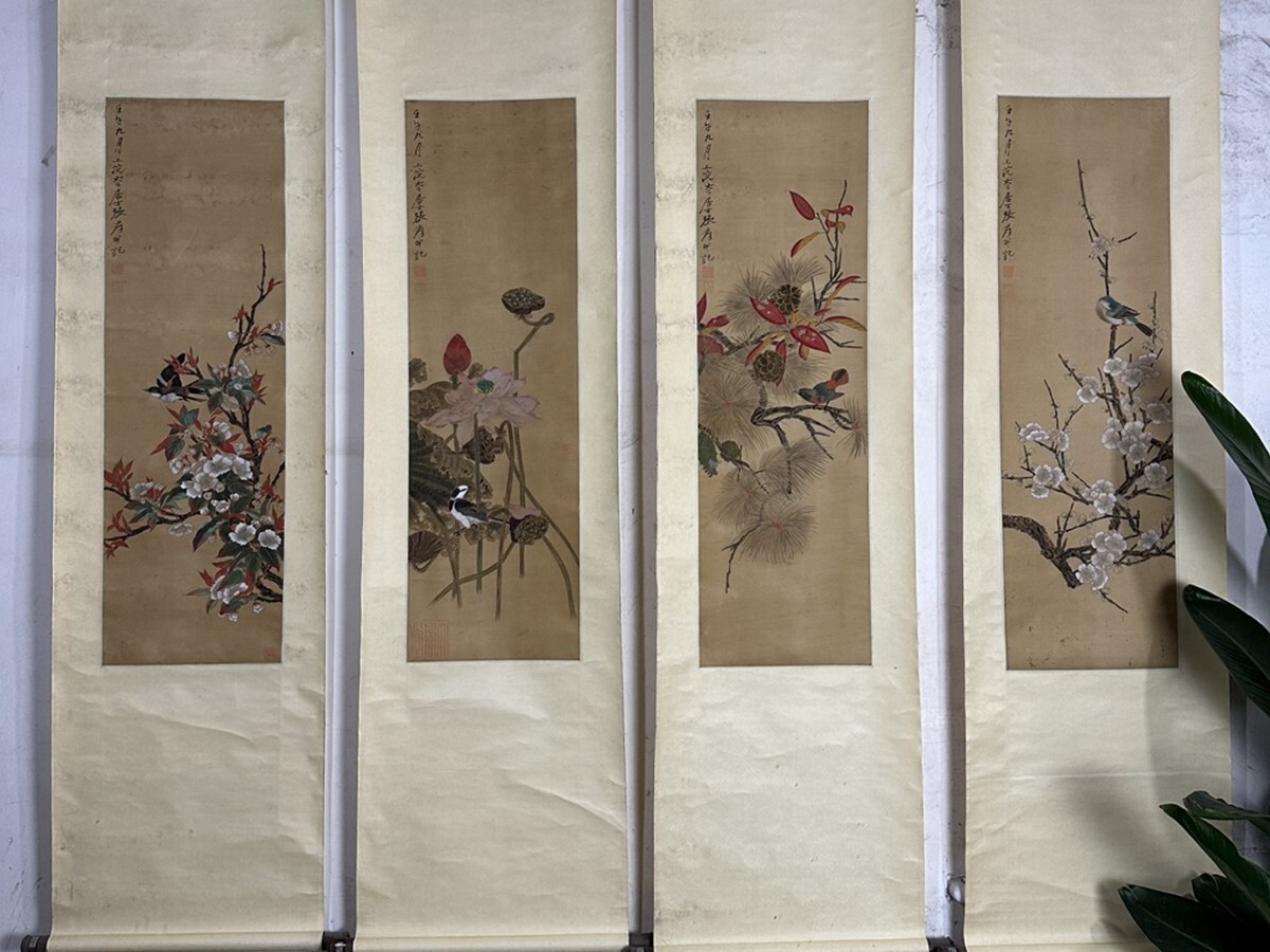 - 古びた蔵 中国書画 近代画家『張大千 花鳥図四條屏 肉筆紙本』掛け軸 書画立軸 巻き物 古美術 骨董品