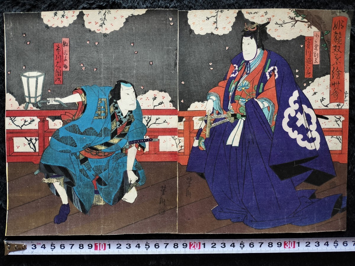 - 【真作】江戸期 本物浮世絵木版画 歌川芳瀧「姫競双葉絵」役者絵 中判 二枚続 錦絵 保存良い 裏打ち