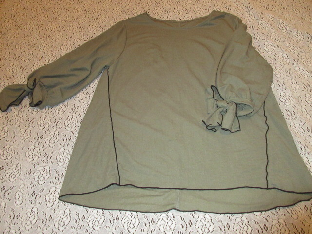 > W)■【・・・】■手洗い可能/レーヨンポリ■優しいグリーン■ふっくら袖口リボン/黒ラインデザイン!■お洒落なブラウス/カットソー■