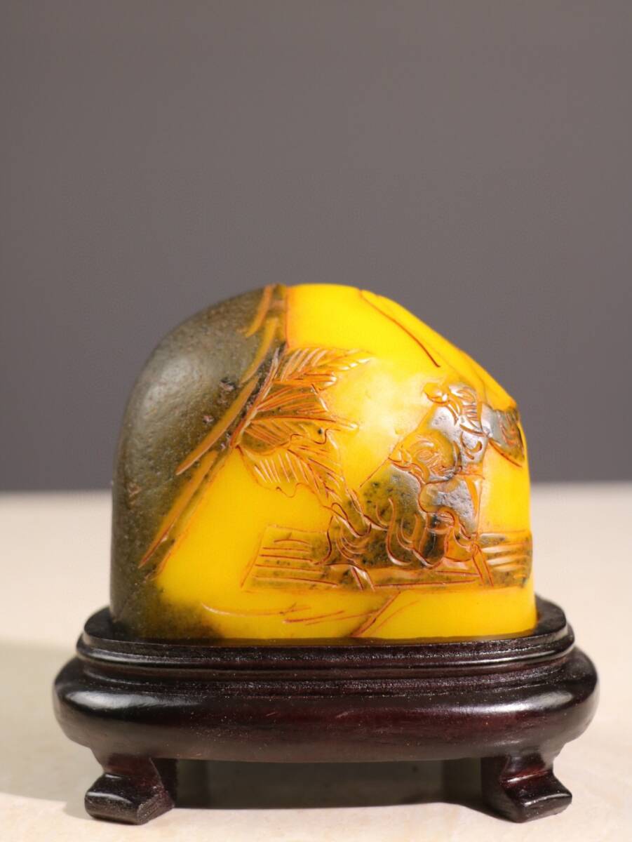 - 【超珍館蔵】寿山石 烏鴉皮 田黄石 細密彫 秋江泛舟紋印章 文房具 書道品 古賞物 古美術品 稀少珍蔵品