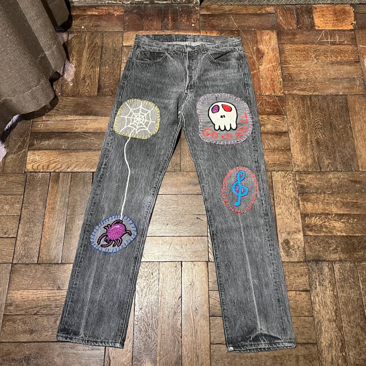 - Vintage 80s Levi's 501-0169 Stripe Black 先染め ブラック W33 L34 80年代 リーバイス 古着 ワッペン パッチワーク リメイク ハチマル
