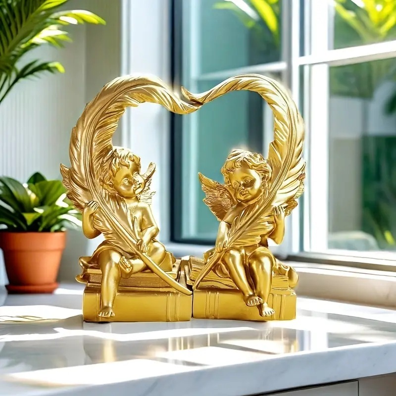 - 2点セット天使の羽ゴールデンハート彫刻愛の羽の天使のかわいい双子の赤ちゃん置物マイナス思考や恐れを取り除いてくれる家族を守ります