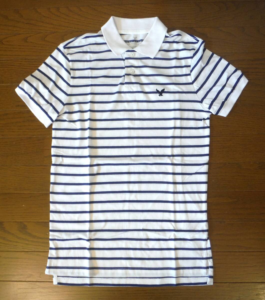 > アメリカンイーグル AMERICAN EAGLE ポロシャツ ロゴ 刺繍 コットン 半袖 XS 青×白ストライプ 小さいサイズ