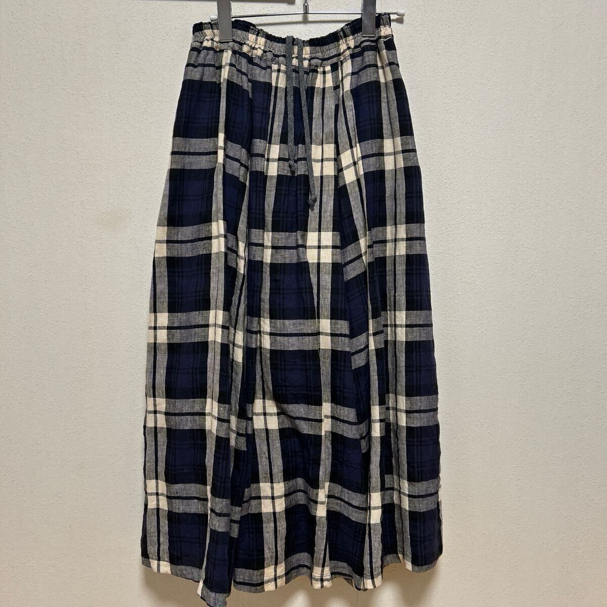 - イチアンティークス ロングスカート リネン100% チェック ネイビー ICHI Antiquite’s ギャザースカートウエストゴム