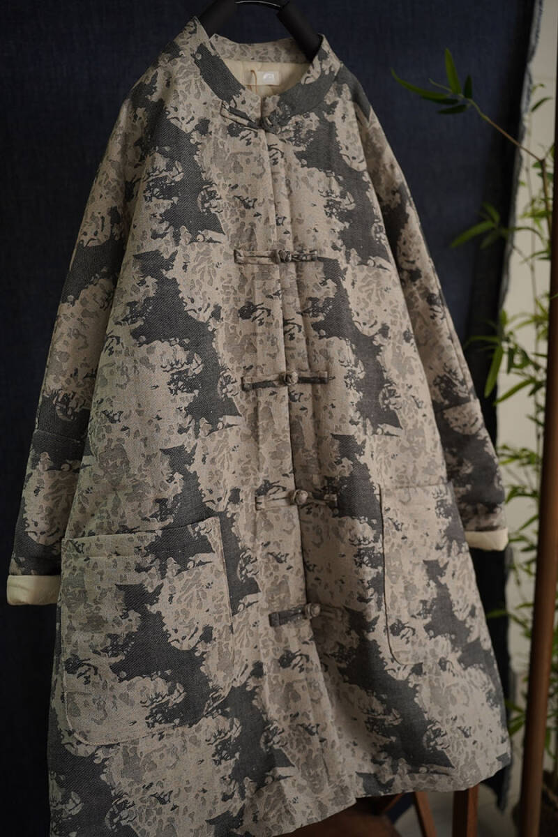- 新入荷新品羽織物 中長コレクション 中綿 織り込み柄 スタンド襟 コート 高質 麻綿混 アンティーク風 手作り 暖かい