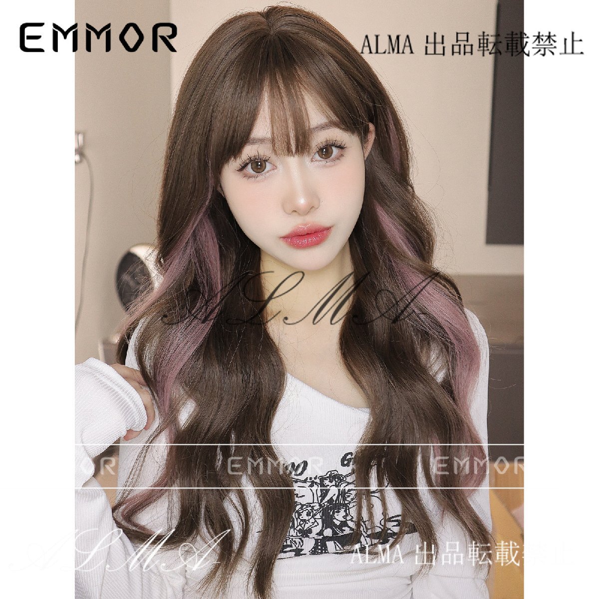 - 新品人毛 長いウェーブヘア ブラウン ピンクのハイライト 軽くカールした つむじ部分手植え 自然に見えますフルウィッグ