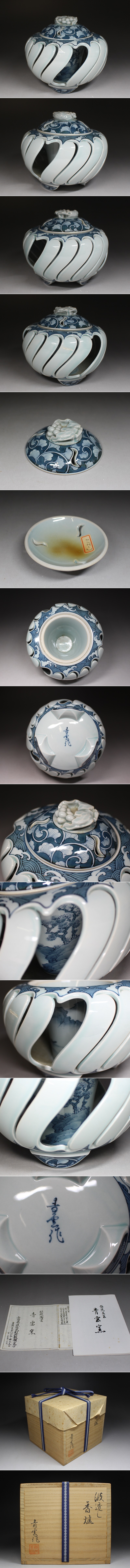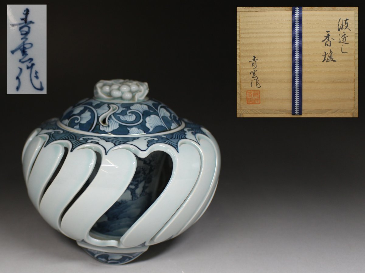 - ■有田■藤井青雲・波透し・香炉・染付絵・山水風物紋・青雲窯・栞・共箱・f6105h