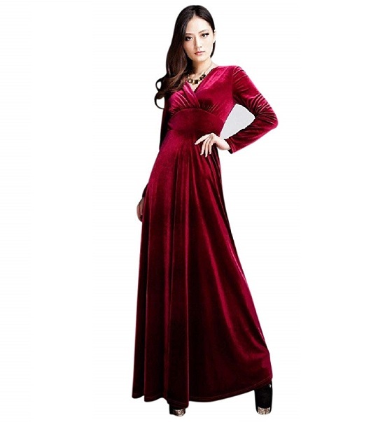 - Vネック ベロア ハイウエスト ロング ドレス (赤 L)マキシ丈 カシュクール ワンピース パーティー