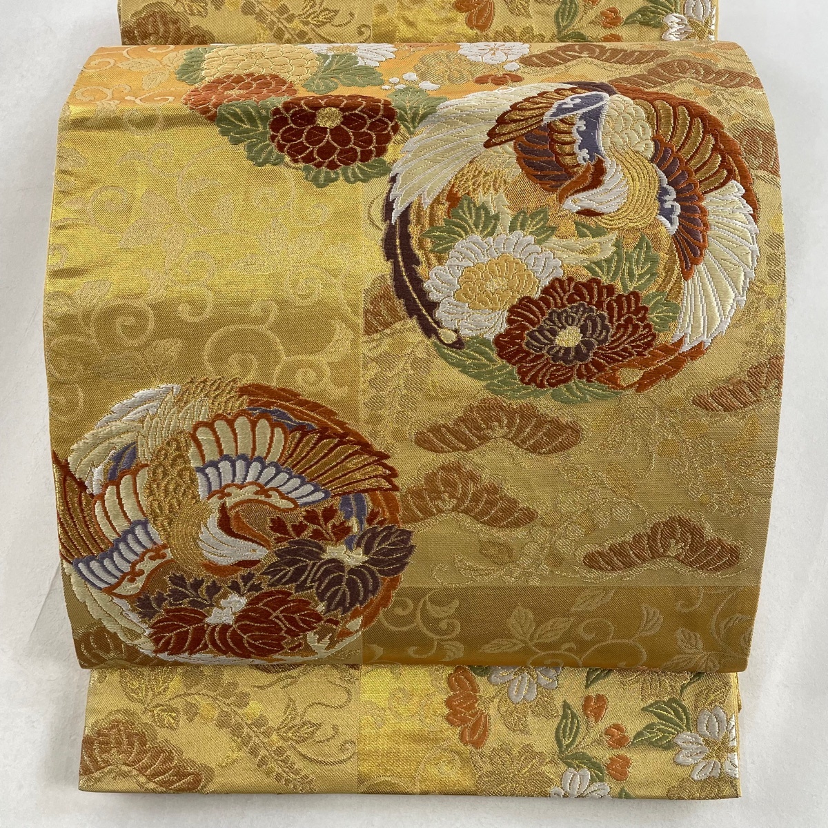 - 【在庫一掃】 袋帯 美品 秀品 鳳凰 草花 刺繍 金糸 金色 六通 正絹 【中古】
