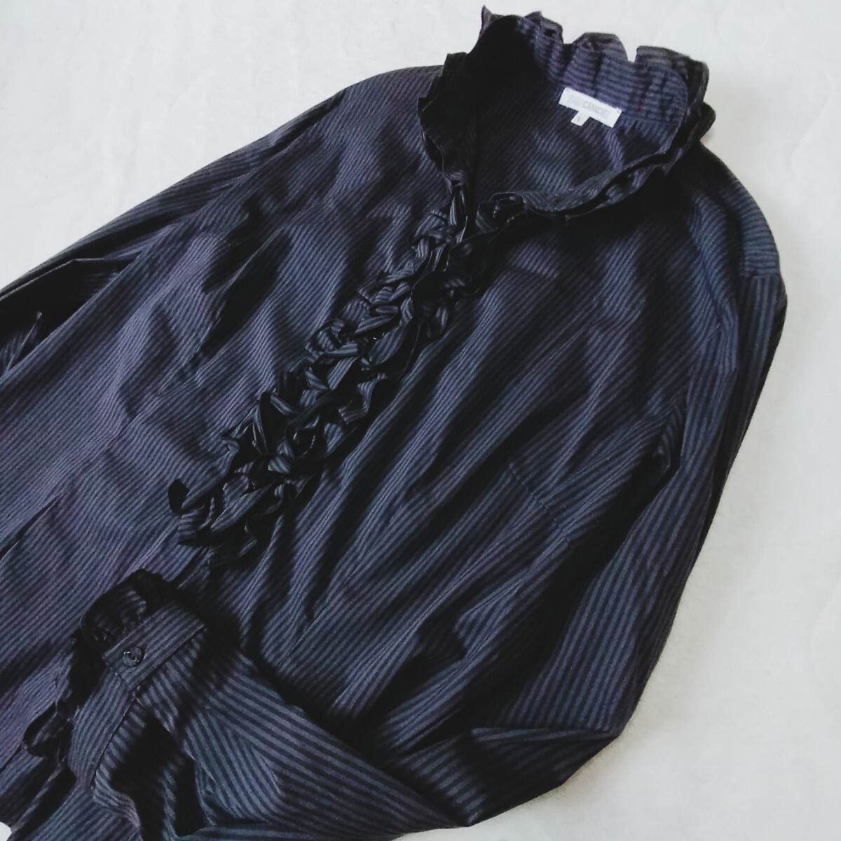 - NARACAMICIE*ナラカミーチェ*大きいサイズⅤ*長袖ブラウス*洗える*ストライプ*フリルスタンドカラー*シャツ*黒×グレー*ルーマニア製
