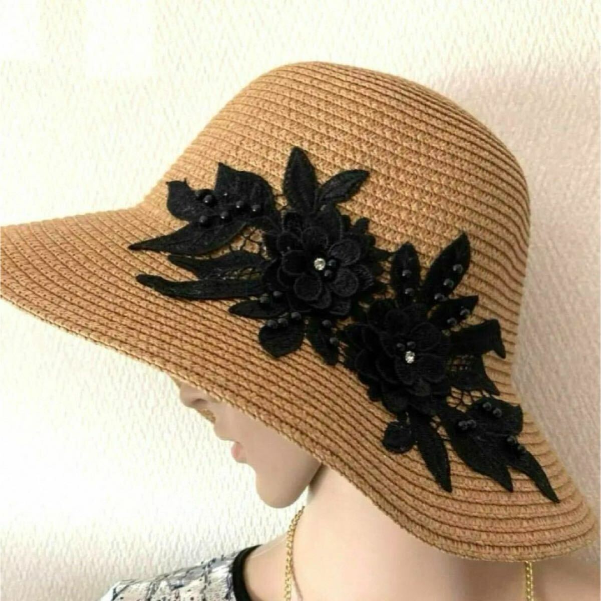 - 麦わら帽子 ハンドメイド 黒 レース 花柄 華やか つば広 UVカット おしゃれ エレガント 夏 海 プール