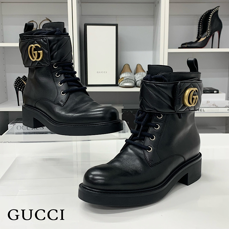 - M11971 グッチ レザー ダブルG キルティング ショートブーツ ブラック ゴールド