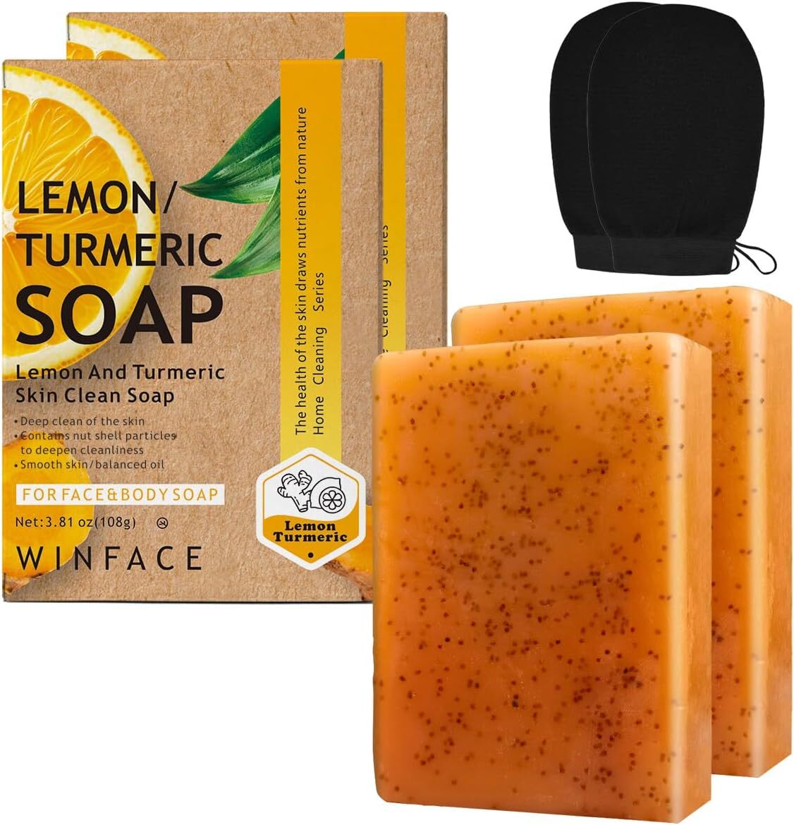 - 2個セット レモン石鹸、ウコン石鹸、複数の植物エキスを添加して肌をケア、ボディ用、入浴、ハンドソープ108g、専用手袋付き、