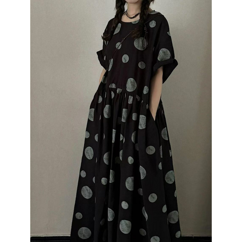 - 新入荷 黒地にドットプリントがおしゃれな ロング丈ワンピ新品大きいサイズかすれドッ トがおしゃれなワンピ