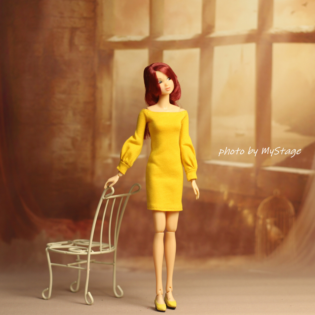 - 人形服msdr-25-4832黄色いオフショルダーバルーンスリーブタイトワンピース(momoko、ジェニー、SAJボディ、OBITSUボディ)