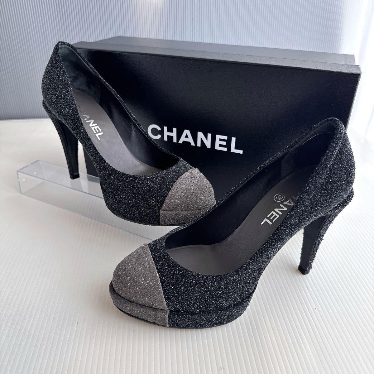 - CHANEL シャネル バイカラー ココマーク 厚底 パンプス ハイヒール サンダル 37 極美品 レーディス シューズ 靴 ブラック グレー