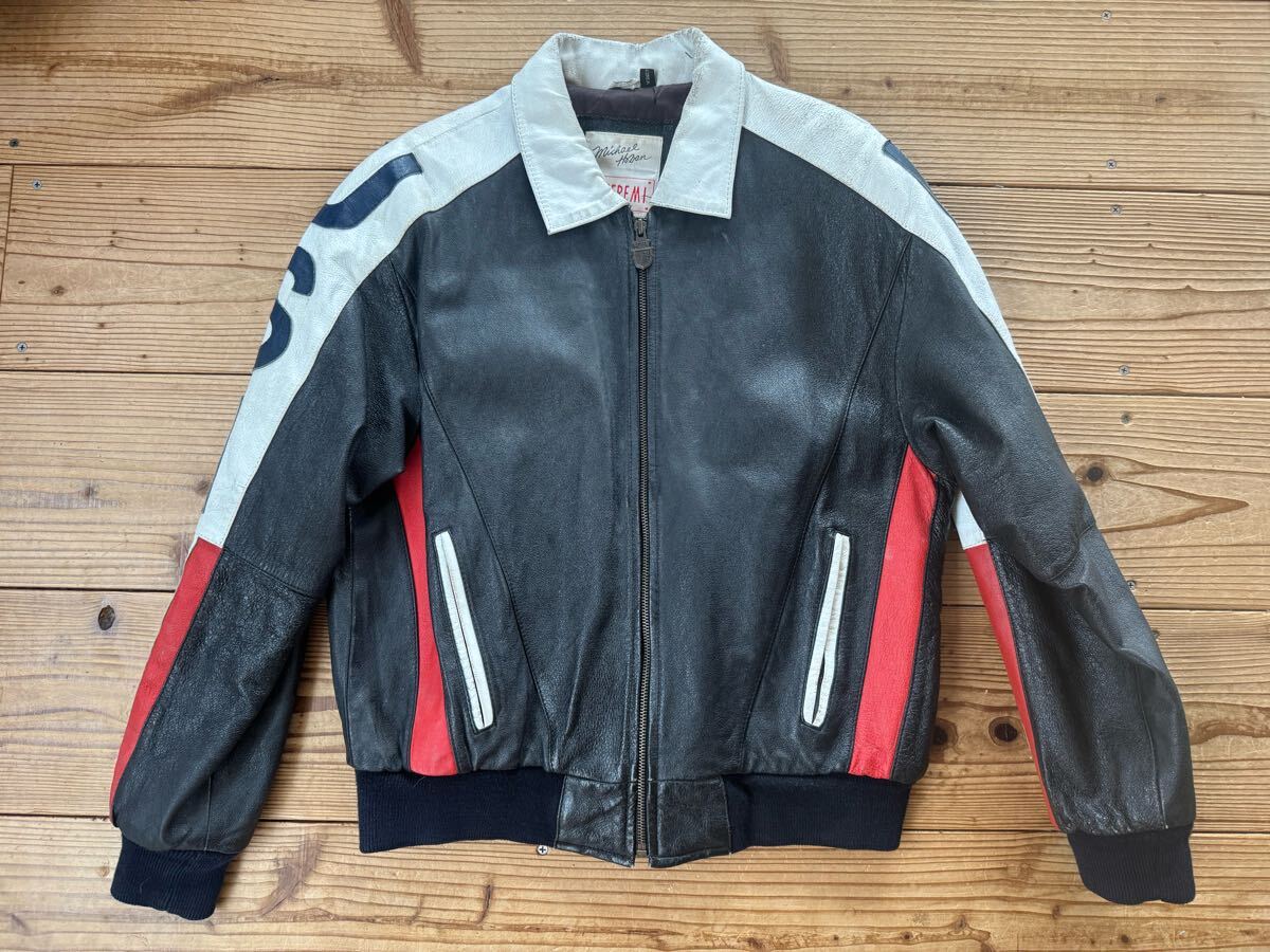 - ★ WHERE MI Michael haban オールド90s古着 USA 星条旗 切替レザー レーシング ライダース Sサイズ USED ハーレー