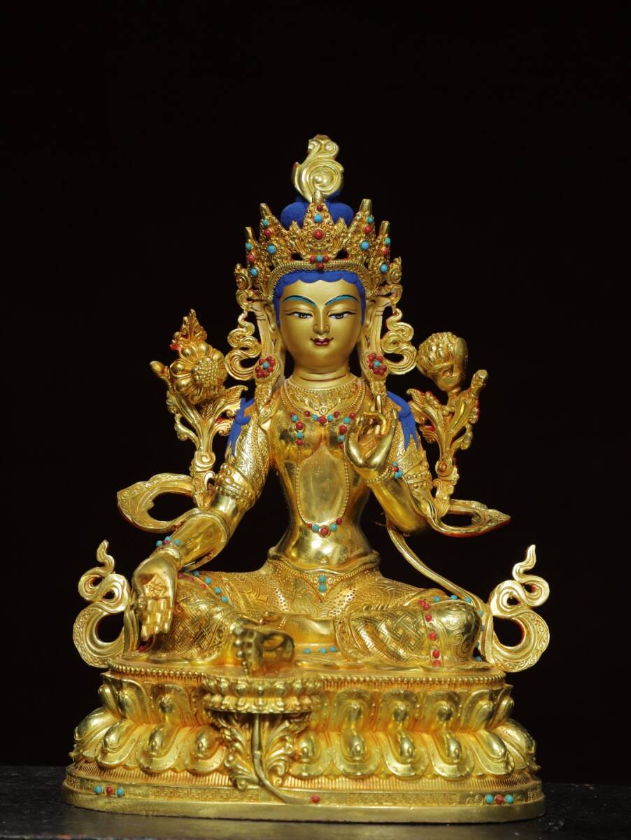 - 明時期 古銅彫 流金 彩絵 綠度母 仏像 仏教古美術 仏教密教 宝石嵌 供奉仏像 文案置物 極細工 古美味 中国唐物 時代物 骨董 中国古美術