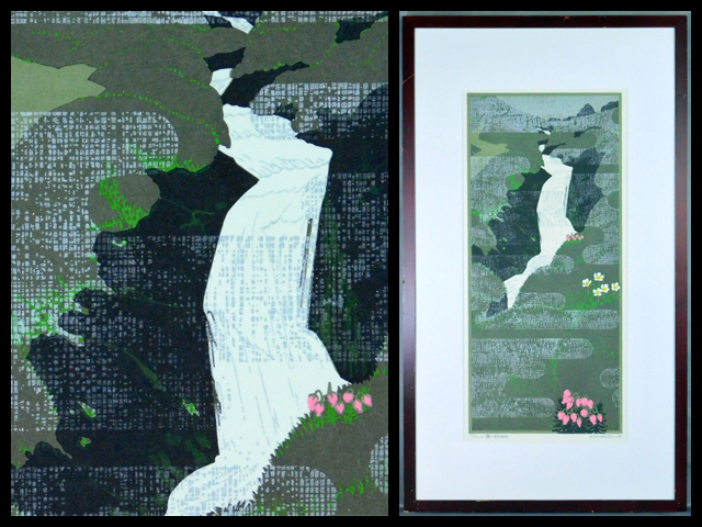 - 大本靖 山霧の銀明水(滝風景 ホタルブクロ 高山植物)木版画 額装 日本版画協会 北海道文化賞 個展多数 s25031604