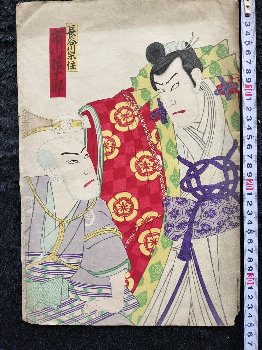 > 明治期/真作 歌川豊斎「義重織田賜」本物浮世絵木版画 歌舞伎絵 役者絵 芝居絵 錦絵 大判 裏打ち