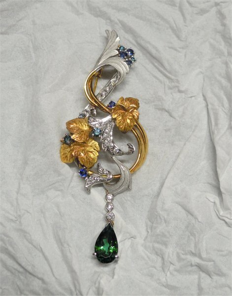 - 石川暢子 アズタイム グリーントルマリン ブローチ 鑑別書付 K18Pt900 TL3.37 D0.87 中古