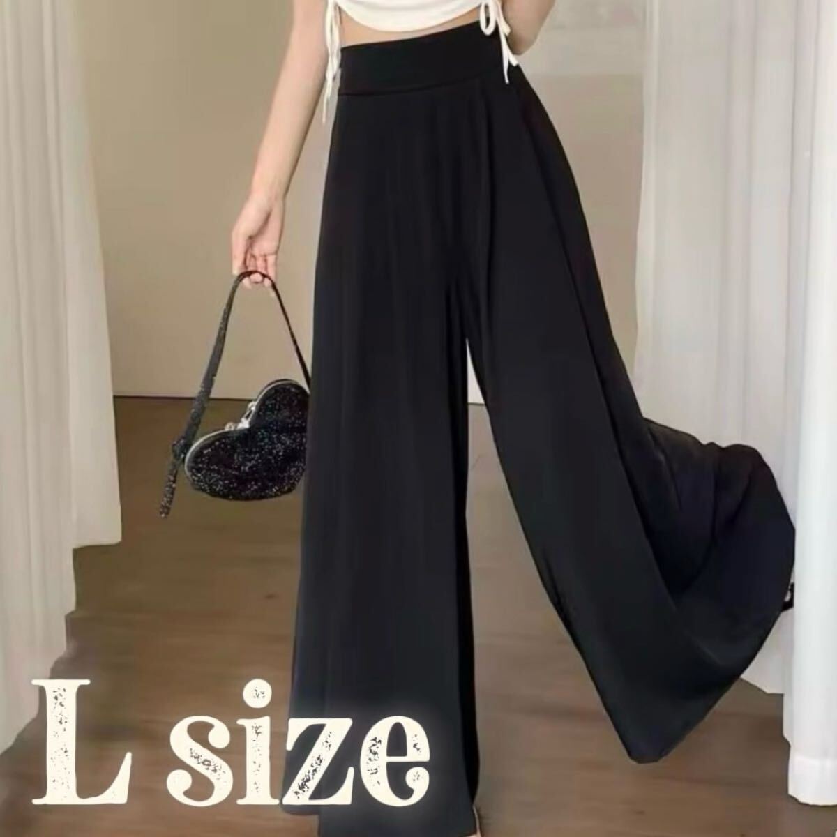 - ハイウエスト ワイドパンツ 楽ちん フレア Aライン ロング 黒 L