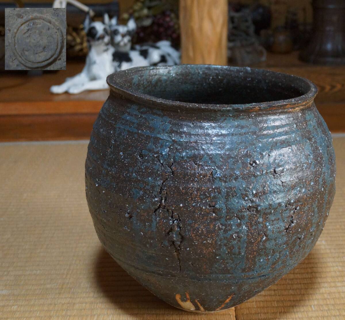 - 【閑】大型青流れ釉大壺 造形飾り壺 大壺 在銘 茶道具 重さ7㎏★時代物★7D0509
