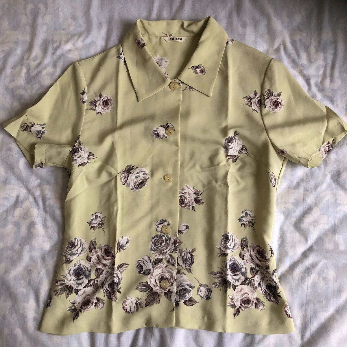 - 【古着】レストローズ 半袖シャツ(2) モスグリーン×ローズ