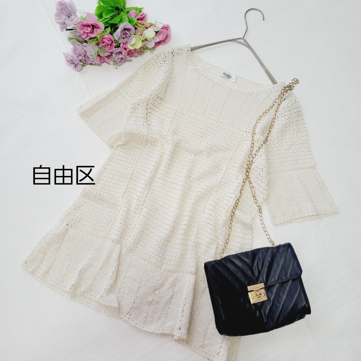 - オンワード樫山 自由区 アイボリー半袖コットンニット 透かし編みニット 春 夏 カットソー チュニック