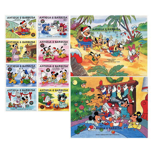 > ディズニー ベビーミッキー 切手/小型シート2枚&切手8枚(1986クリスマス) 発行国Antigua & Barbuda 1985年発行 新品