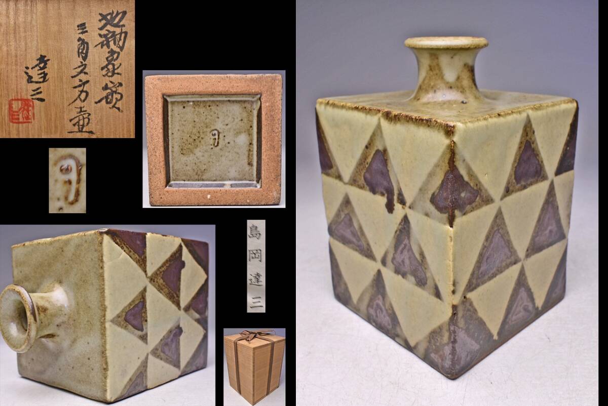 - 島岡達三 ★ 地釉象嵌三角文方壺 ★ 共箱栞 ★ 珍品 ★ 人間国宝 ★ 益子焼 ★ 浜田庄司 師事 ★ 角瓶 ★