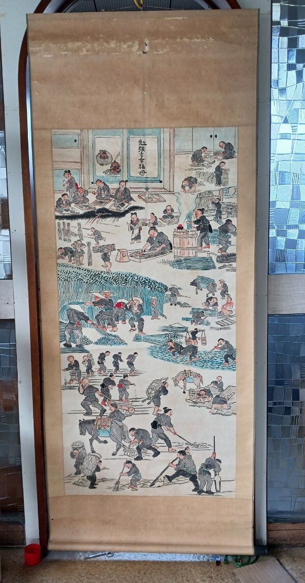 - 掛軸 勉強南幸福母 浮世絵 労働 190cm×75cm 掛け軸 骨董品 古画