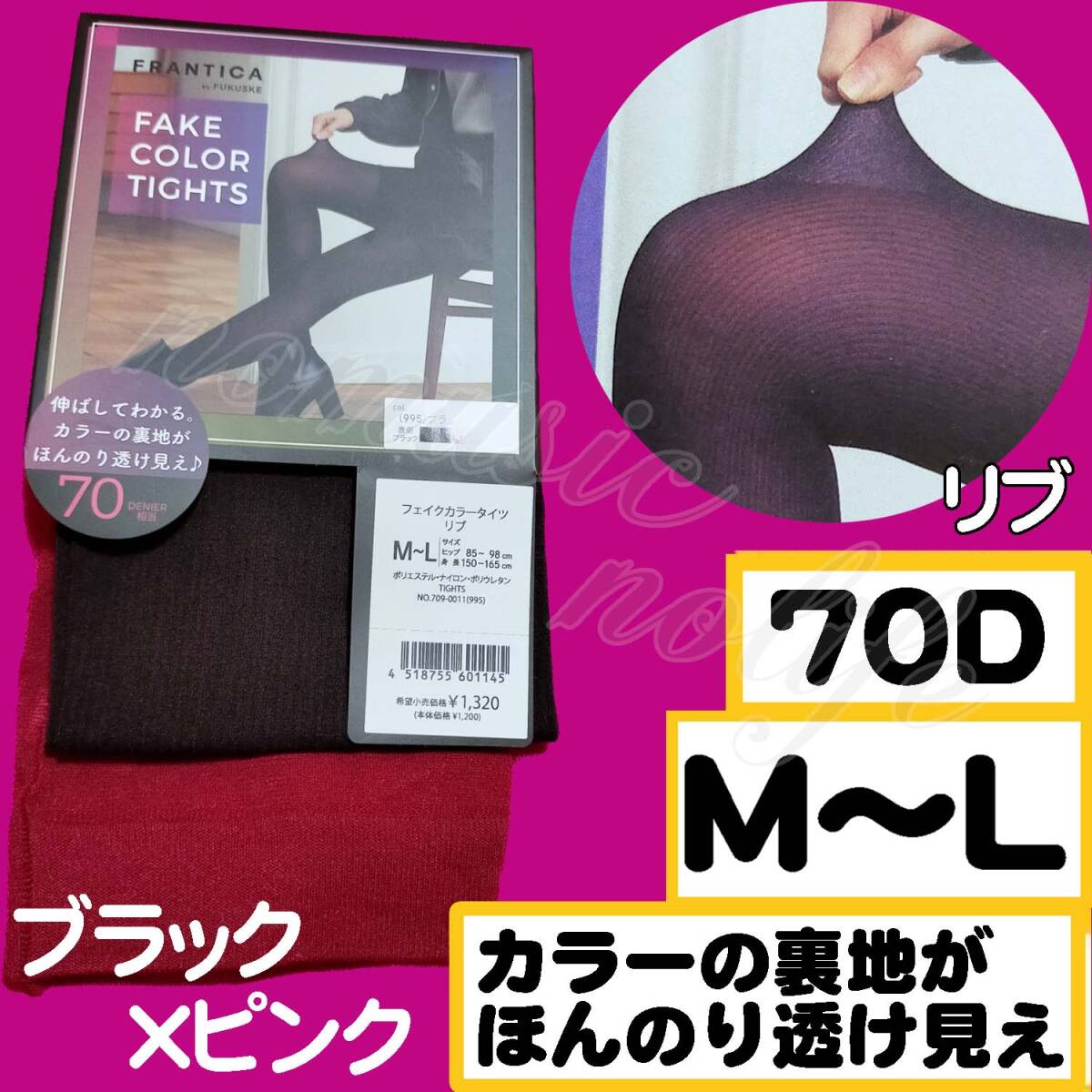 >  匿名★同梱歓迎【ZZZ】★フェイクカラータイツリブ FRANTICA 70デニール ストッキング パンスト M-L 日本製 福助 黒×ピンク