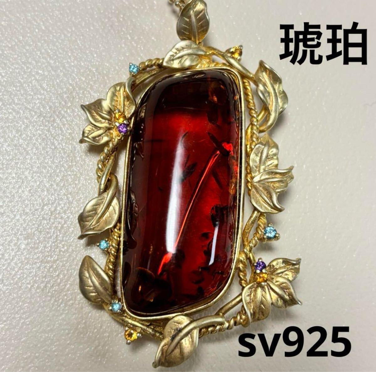 - 美品①琥珀×天然石 ゴールドネックレス◇彫金◇アンバー◇ブラウン◇SV925