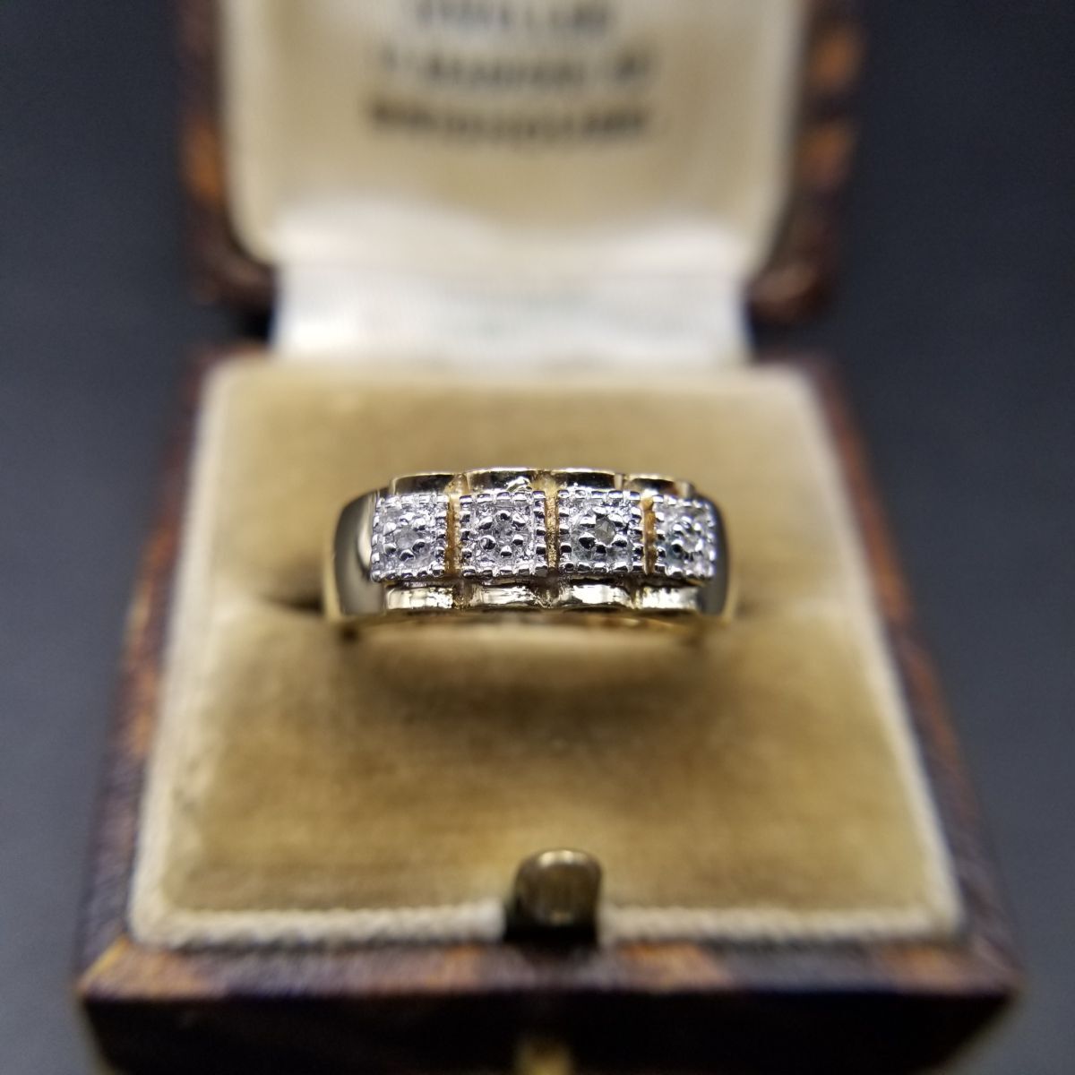 - キュービックジルコニア 4石 インレイ スクエアカット ヴィンテージ リング シルバープレート 上品 エレガント ゴールドトーン Y6-N