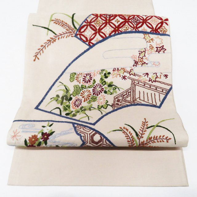 - 袋帯 中古 リサイクル 相良刺繍 中国三大刺繍 花の図 七宝 扇面 お太鼓柄 正絹 カジュアル ベージュ系 きもの北條 T697-16