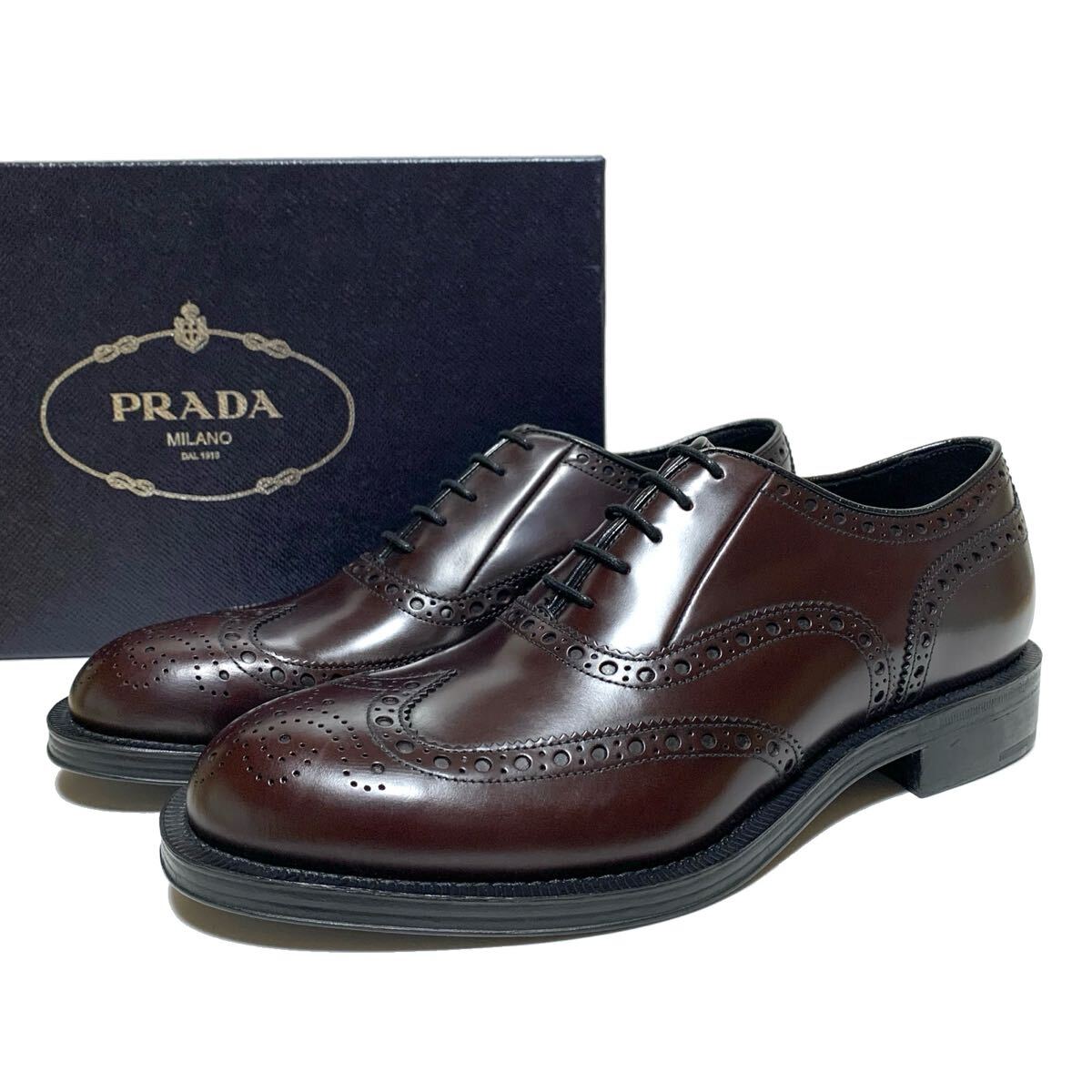 - ☆未使用 PRADA プラダ 内羽根 ウイングチップ レザー ドレスシューズ 赤茶色 イタリア製 革靴 ブローグシューズ ビジネスシューズ