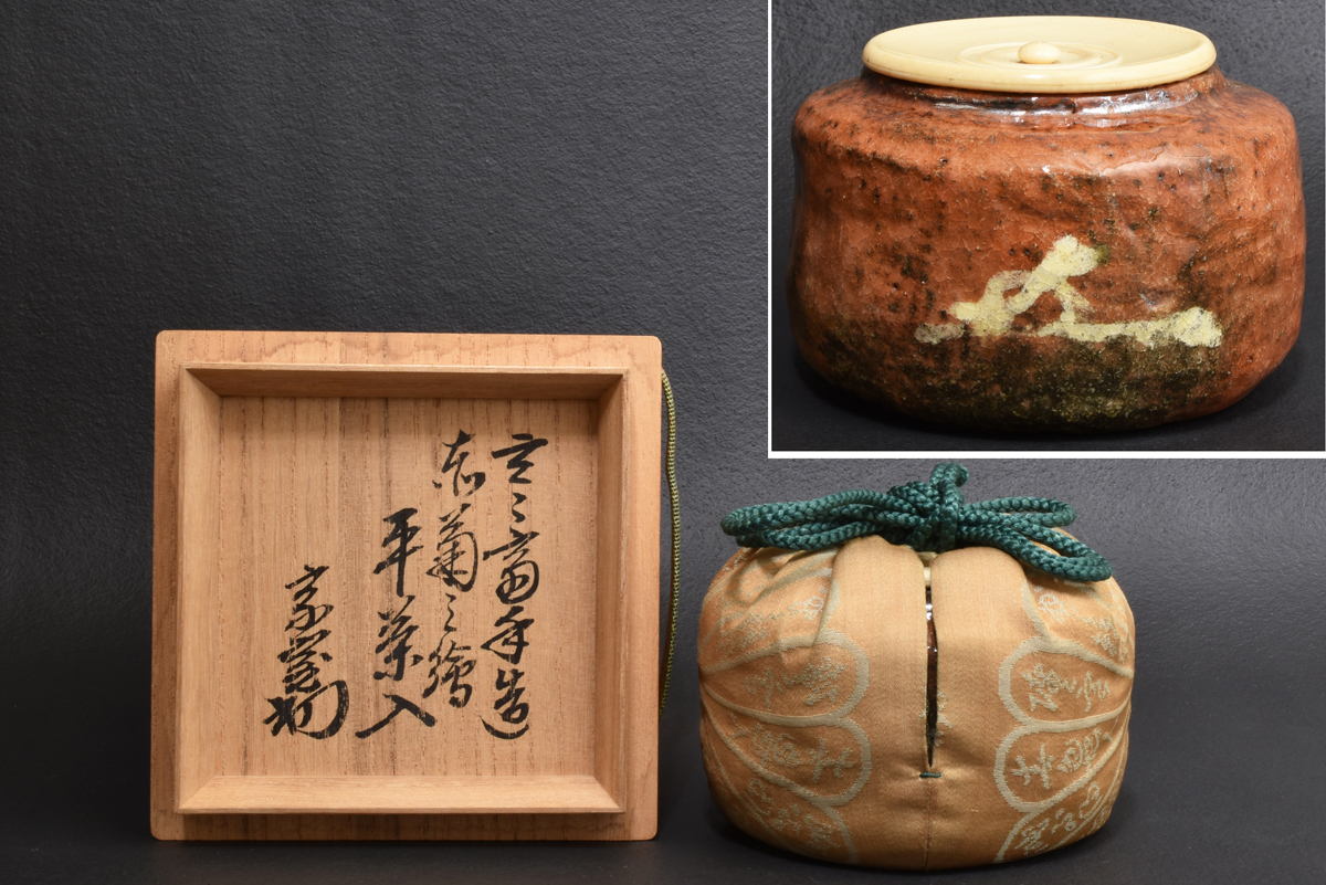 - 5732 玄々斎手造 菊之図 平茶入 淡々斎書付 仕覆 裏千家