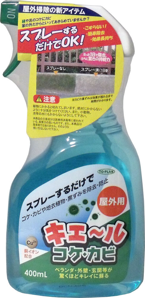 ▼▼▼▼▼▼注意事項▼▼▼▼▼▼・送料込み(送料650円が商品価格に含まれています) 一部地域では追加送料あり。・お取り寄せ商品です。弊社にて手配後、メーカー・卸業者からの直送になります。・まれにメーカー欠品、出荷遅延等が発生致します。問題発生時は別途メールにてご連絡致します。・配送方法の指定、日時指定、置き配、ギフト対応、他商品との同梱配送などは対応できません。・まとめ買いや複数購入の場合は通常より発送に時間が掛かる場合がございます・複数個口の場合、2階以上への搬入ができない場合があります。(その場合は1階での受け渡しとなります)・大型連休、お盆、年末年始などは発送をお休みさせていただく場合がございます・メーカー都合により、パッケージは予告なく変更される場合がございます・梱包用のダンボールはリサイクル品を使用させていただきます。・注文に関するご連絡(注文確定通知・発送通知など)はメールでご案内させていただきます※商品ページの内容について、少しでもご不明な点などがございましたら購入前に一度ご連絡ください▲▲▲▲▲▲注意事項▲▲▲▲▲▲〇商品説明ベランダ・外壁・玄関等が驚くほどキレイに蘇る!こすらない! 簡単除去! お墓参りにも便利です!【成分】塩化アルキルジメチルベンジルアンモニウム・銅化合物・防腐剤【液性】中性【用途】外壁・ベランダ・門柱・玄関・タイル・レンガ・踏み石・墓石等、建造物に付いた美観を損なうコケやカビ・地衣植物・黒ずみを除去します。【使用方法】・1本で約4〜8平方メートルの面積に散布できます。・散布場所が十分湿るまでスプレーしてください。(水洗いは不要です)・軽いコケやカビは翌日に除去されますが、汚れの度合い、気象条件によって効果の現れる日数は異なります。雨天時は効果が薄れます。・地衣植物は効果が表れ始めたころにブラシで取るか自然に枯れるのを待ちます。 厚く付着している所には繰り返し散布することにより効果を発揮します。【注意】・屋外専用ですので屋内では使用しないでください。・農薬(除草剤)としては使用できません。・予め目立たないところで噴霧し変色等異常のない事を確認の上使用してください。・高い場所には使用せずスポンジ等で薬液をつけてください。・使用後はスプレーの先端をOFFにして子供の手の届かない冷暗所に保管してください。・酸性の製品・食酢・アルコール・アンモニアその他薬品や洗剤と混ぜないでください。(ガスが発生したり効果が薄れる事があります)・スプレーをする時に液を吸い込まないように風向きに注意し風の強い日は避けてください。・使用時はマスク・保護眼鏡・ゴム手袋を着用し使用後は手を良く洗ってください。・衣類に付着したときは、水でよく洗い流してください。・金属製品にかかるとシミや錆の原因になりますので使用しないでください。かかった時は、水洗いしてください。水洗いできないものや衣類等布製品、合成ゴム・合成樹脂には使用しないでください。・黒ずみの除去効果は3〜6ヶ月後に現れます。徐々に薄くならない時は再び散布してください。・薬剤が植物に掛ると枯れますので、薬剤及び噴霧液が植物にかからないように注意してください。・魚毒性がありますので金魚鉢・水槽・河川・池等へ薬液がかからないように注意してください。・化学薬品に敏感な方やアレルギーのある方は、使用しないでください。〇商品仕様個装サイズ:95/200/55mm個装重量:約480g内容量:400ml製造国:日本【発売元:株式会社東京企画販売】(出典:東京企画販売)