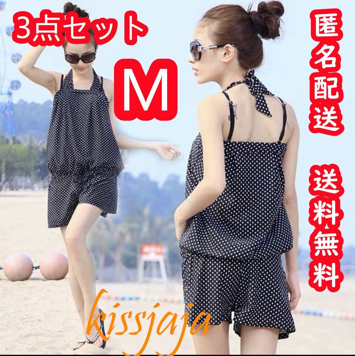 - 水着レディース ビキニ ロンパース 女性用 3点セット 三角ビキニ水玉 ドットM
