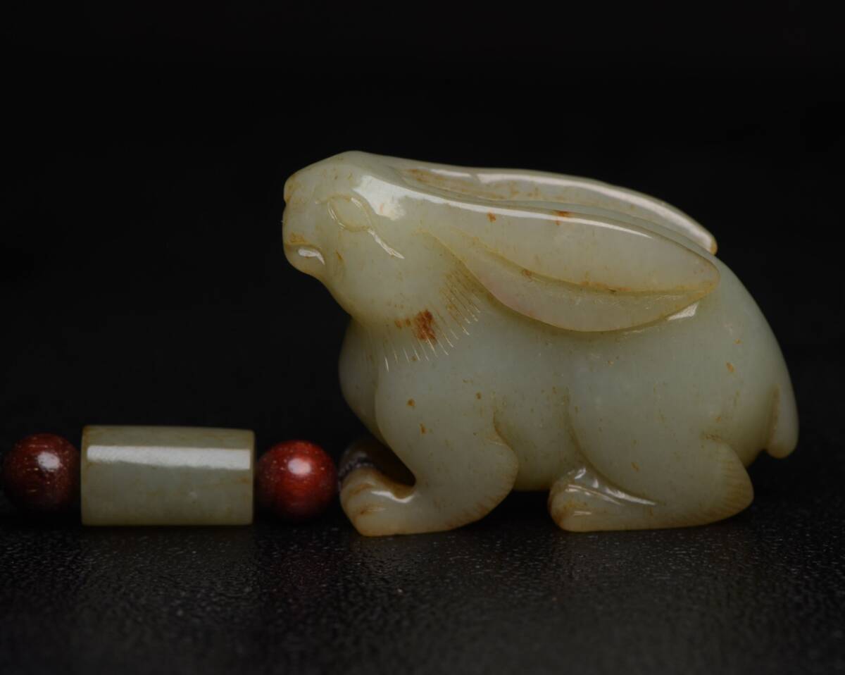 - 【仁】『和田玉製・細密彫・玉兔・置物・賞物』極細工 古賞物 古董品 中国古玩 古美術 古美味 時代物 旧家蔵出